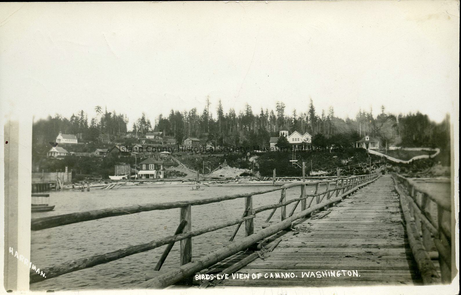 View of Camano Island from the dock in Utsalady. Dock was destroyed in 1923 when struck by the steamer "Atalanta" which ran from 1922-1936.