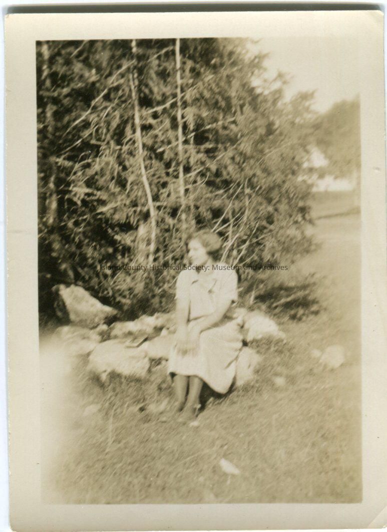 Photo of a young woman seated on a rock in front of a stand of skinny trees. She is wearing a knee-length short-sleeve dress. These photos are from Newberry family folder.