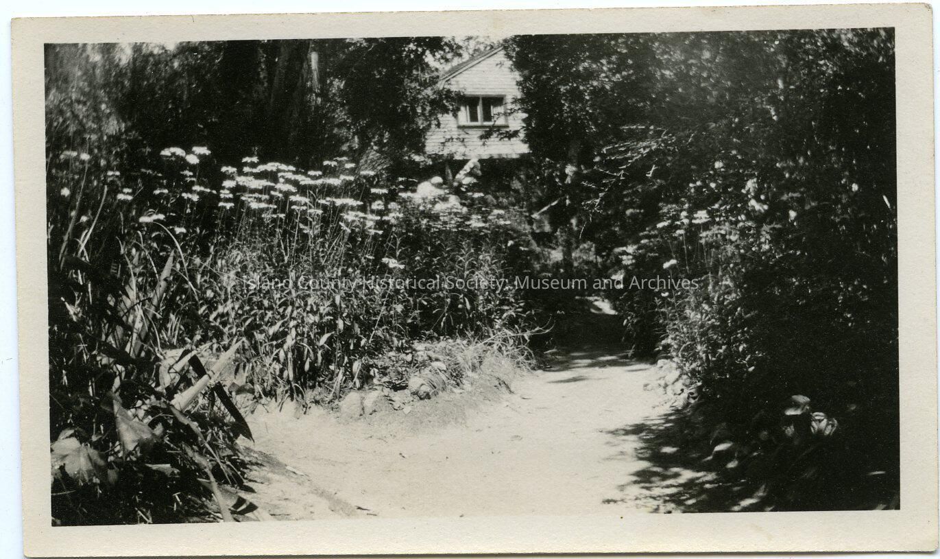 Dirt road leading through garden and trees to a house in the background. On the back: "Entrance to Edyecliff ... Cal 1927"
