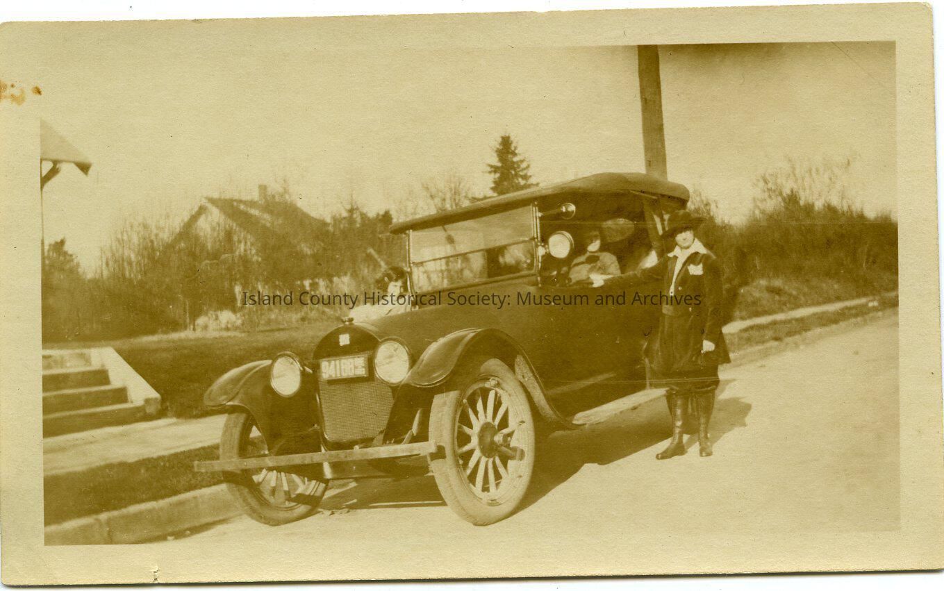 Three women - two outside and one in driver's seat of a car. License 94188. The woman on the right is wearing knee-high shoes or boots, a floppy hat.