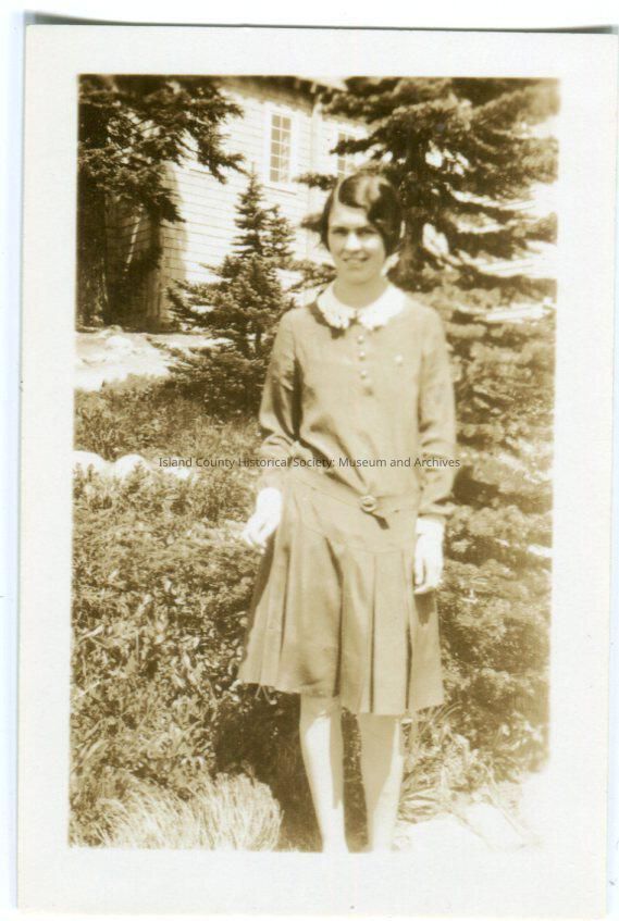 Photo of a young woman standing in front of some trees and bushes, with a two-story building behind her. She is wearing a knee-length long sleeve dress with pleats from the drop waist, lace collar and cuffs.