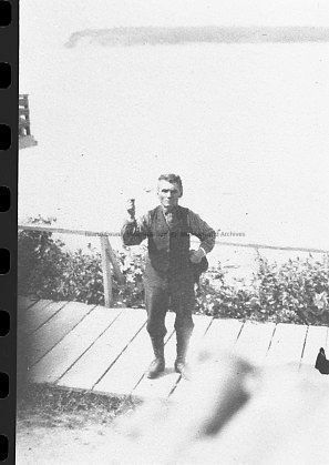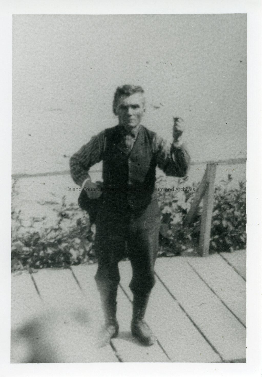 Black and white photo of Billy Barlow (William Squiqui). Given by Lillian Huffstettler. Billie is standing with one hand pinching his fingers together in his other hand he is holding his hat.