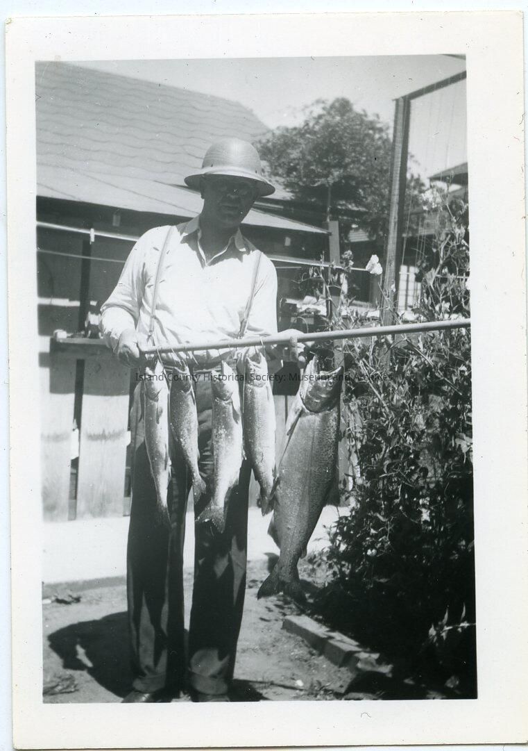 Written on the back "Vin and his morning catch, including a nine pound salmon. July 1941.