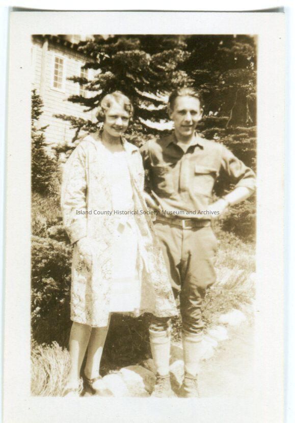 Photo of a young woman and man standing in front of some trees along a path. She is wearing a dress with a double stripe at the hem and a coat. He is wearing a shirt with pockeets, trousers with knee-high socks and hiking boots. His hands are on his hips. A building is beyond the trees behind them.