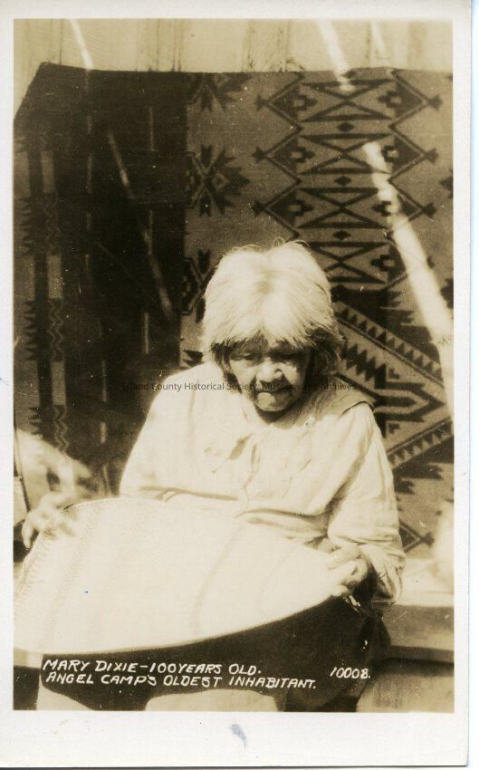 A postcard of an Indian woman sitting holding what looks like a basket. Bottom of postcard reads: Mary Dixie-100 years old. Angel camp's oldest inhabitant. This postcard was printed between 1925 and 1942.