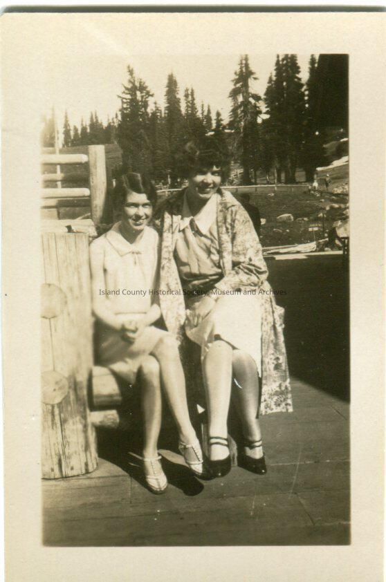 Photo of two young women seated on a wooden bench beside a fence with trees and stones behind them. A man and animal are in the distance. The woman on the left is wearing a dress with a collar, t-strap shoes; the one on her left is wearing a dress with a collar and an overcoat and double-strapped shoes.