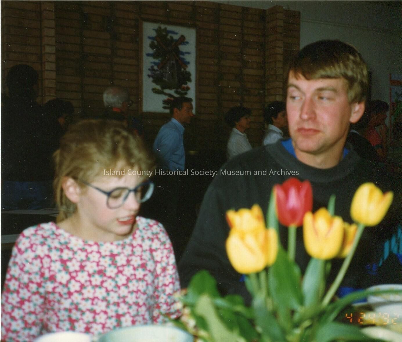 Photo of a man and woman or girl sitting at a table in a hall. Tulips are in a vase in front of them.