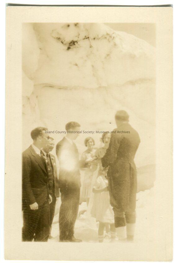 Photo of a group of 4 men and women. They are standing in a rock formation. The man on the far right is wearing a tux with hiking boots and long socks and is holding a book. The men are in suits. The women are wearing dresses; there is a girl between the women and the man on the right. This looks like a wedding.