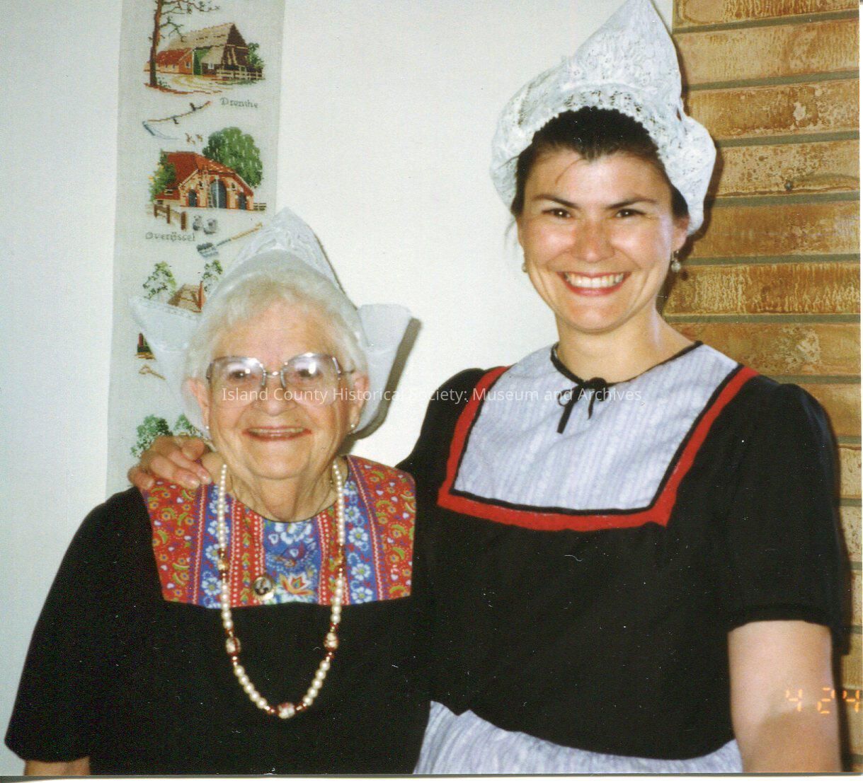 Photo of two women in Dutch traditional dress standing in front of a white wall and wood paneled wall, wall hanging showing small images of old houses.