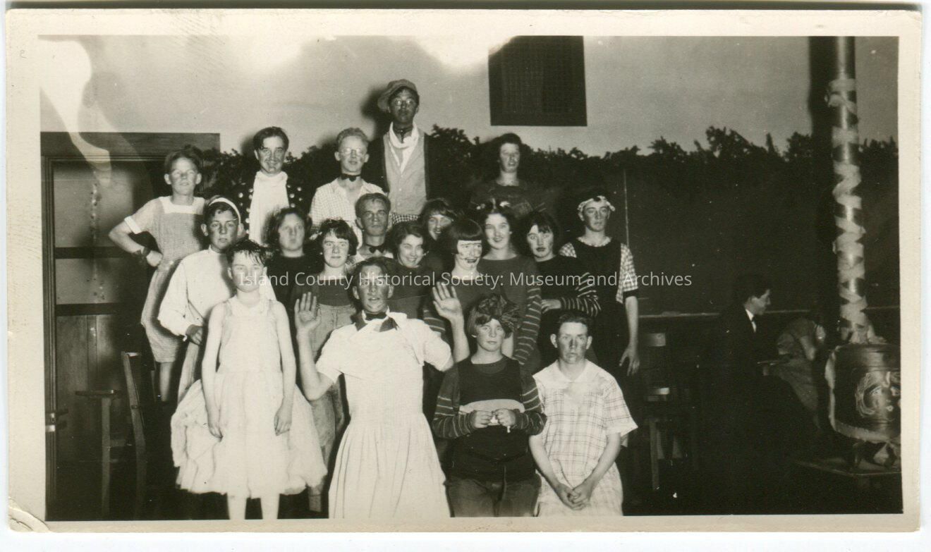 Photo of a group of young people in costumes with dirty faces. A pole to their left has ribbon around it. It looks like a school room. These photos are from Newberry family folder.