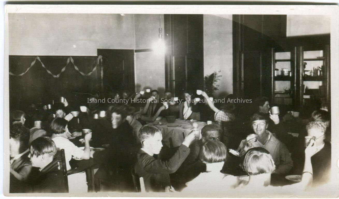 Photo of a group of young adults seated at long tables, probably in a school, raising tin cups. Some look like their faces are dirty. These photos are from Newberry family folder.
