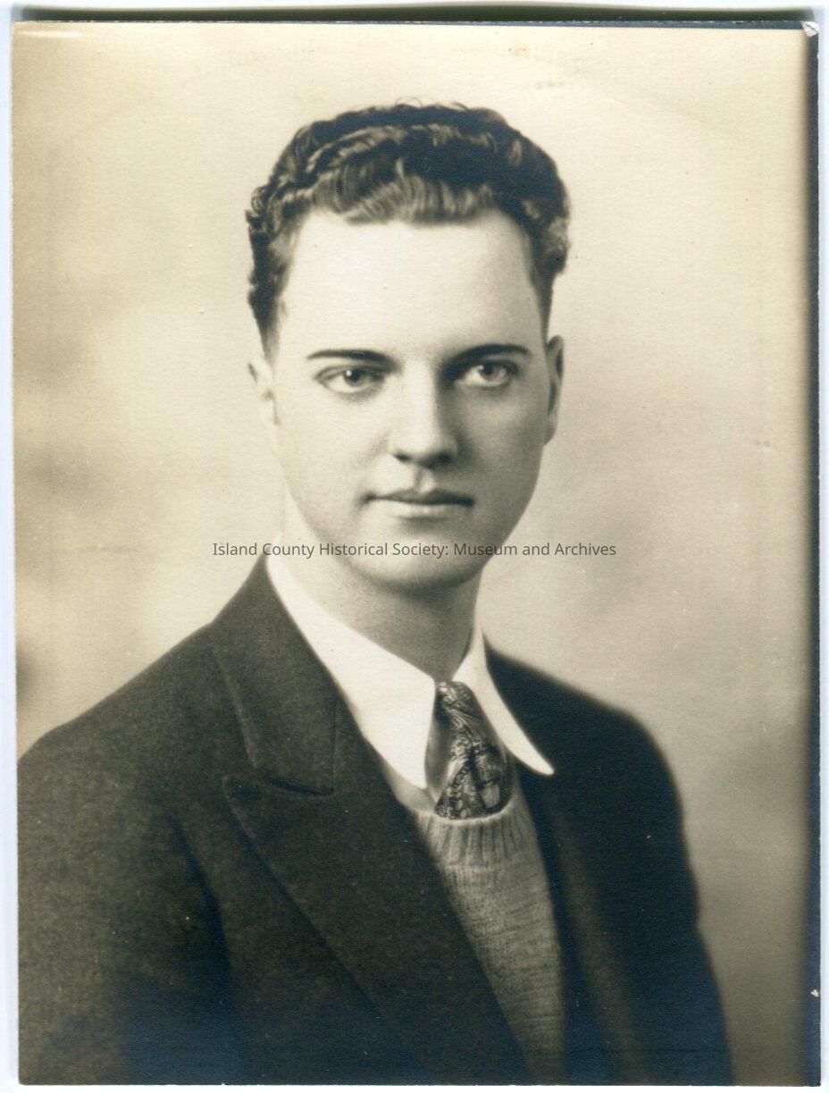 Photo of a man facing to his left. He is wearing a suit, sweater, and paisley tie. These photos are from Newberry family folder.