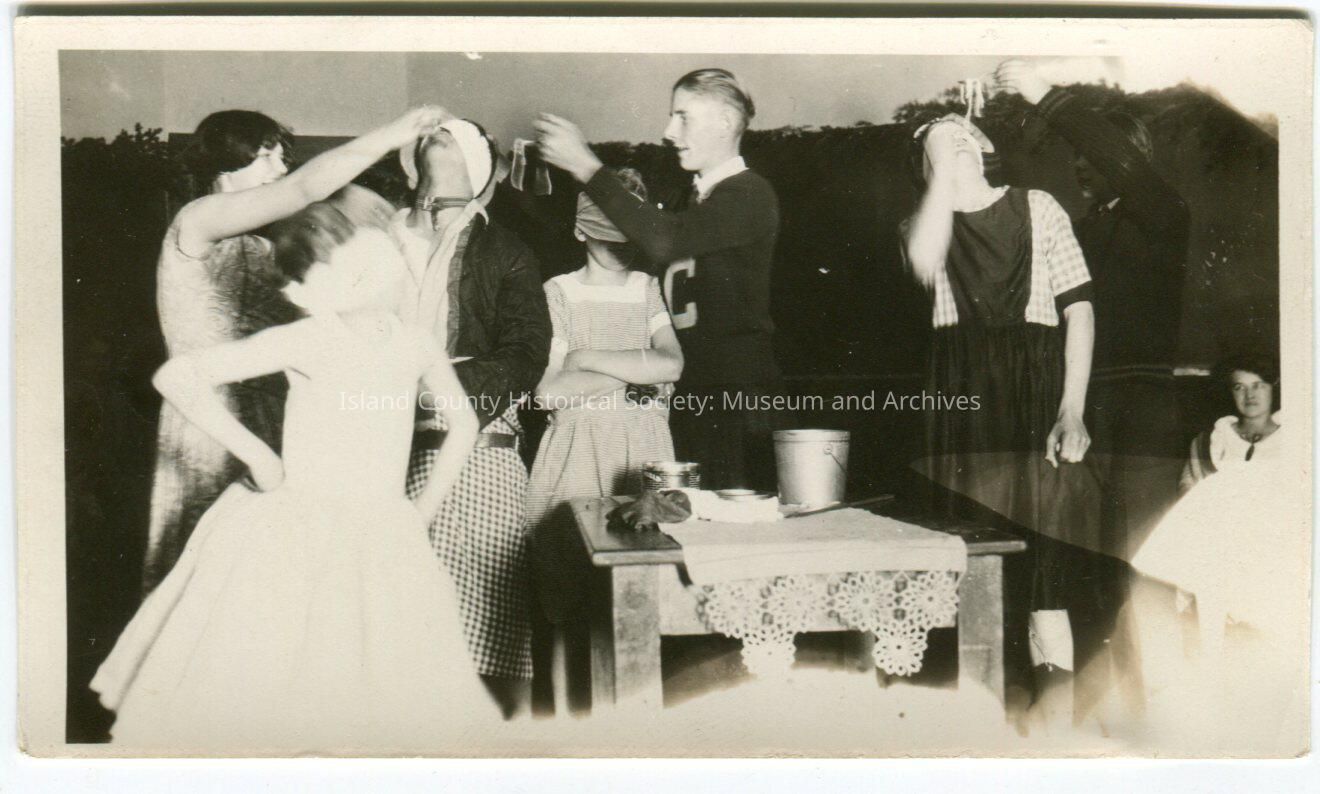 Photo of a group of young adults, probably in a school. Some appear to be in costume. Some are holding up spaghetti for others (who are blindfolded) to eat. The young man in the middle has a C on his sweater. A table in the middle has two tins and a tablecloth with tatted round pieces at the end.