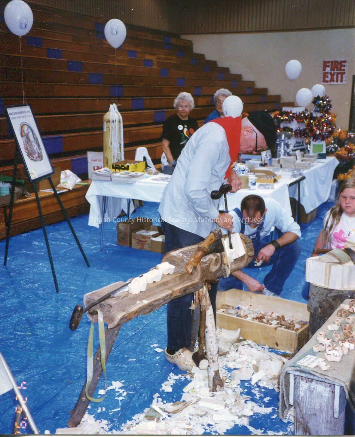 Photo of men, women and a girl in an auditorium or gym. One man in a white jacket, dark flat cap, red kerchief and wooden shoes is carving wooden shoes. The table in back is selling heliu balloons (helium container). (Date on photo is 4 25 '92).