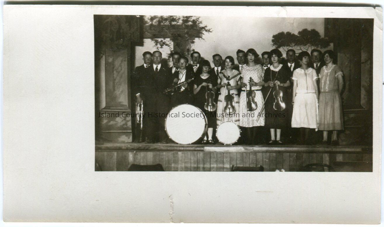 Photo of a group of young adults and one man at the left front, probably in a school. Some are holding instruments; probably a school band or orchestra. Several violins, trumpet, clarinet and drum kit. They are on a stage.