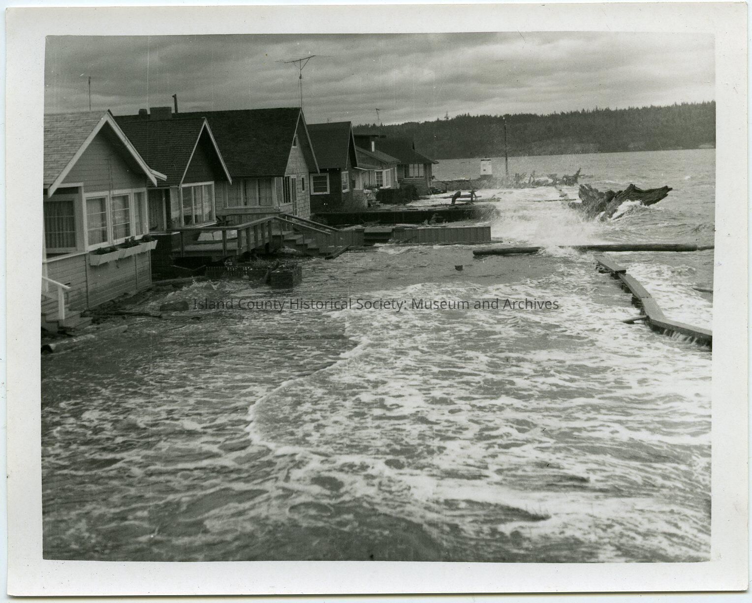 Waves crashing over a break wall, stopping in front of 6 houses on the beach. To the right is a large mass of land.