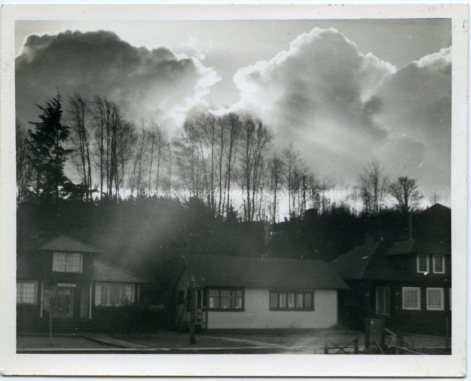 Three houses in front of a ridge of trees with dark clouds over the trees. The house in the middle is a light color while the two two on either side are dark.