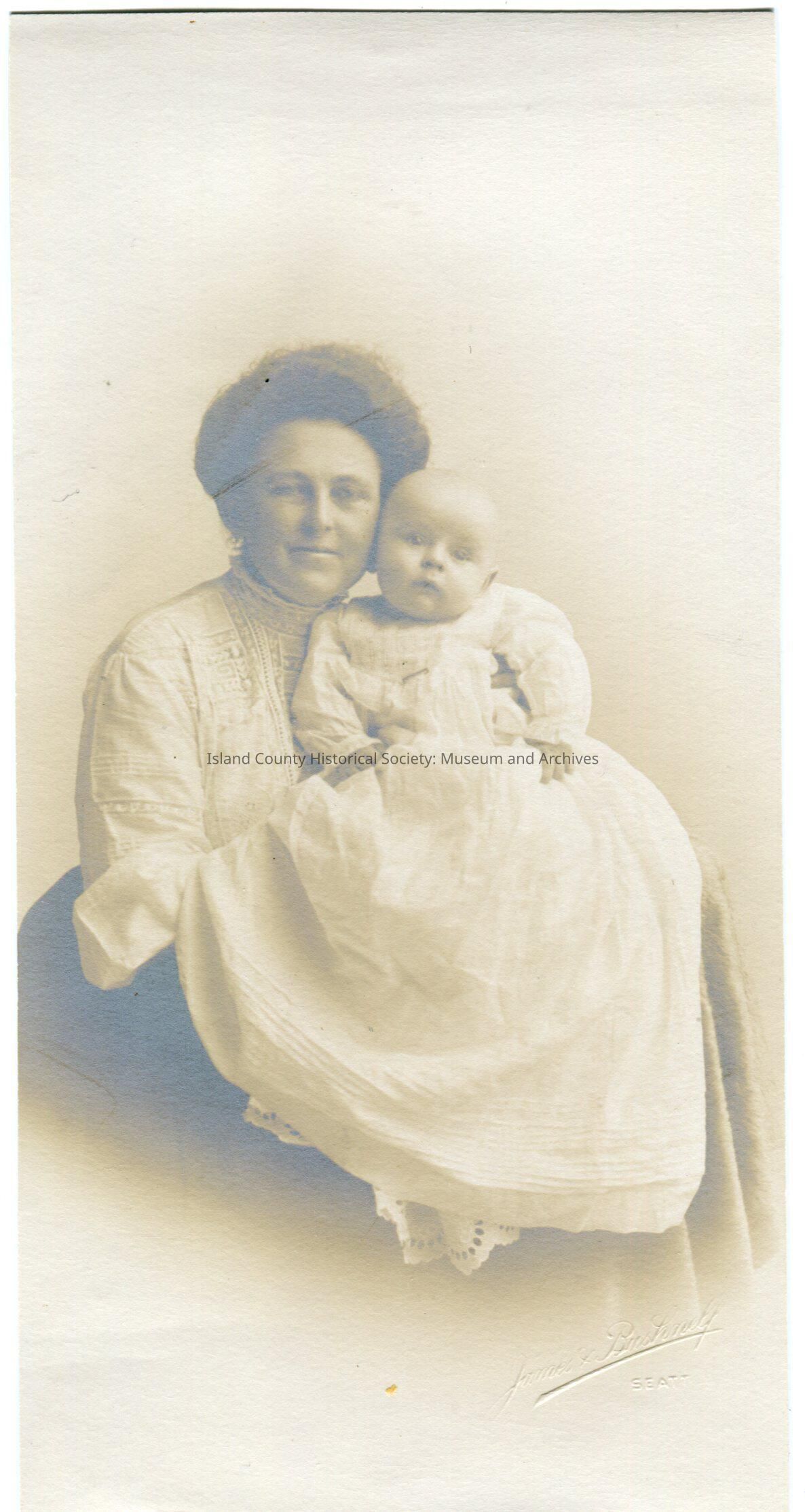 Photo of a woman holding a baby upright in her arms. She is wearing an eyelet blouse with a high collar and rolled up sleeves. The baby is weraing a long eyelet christening gown.