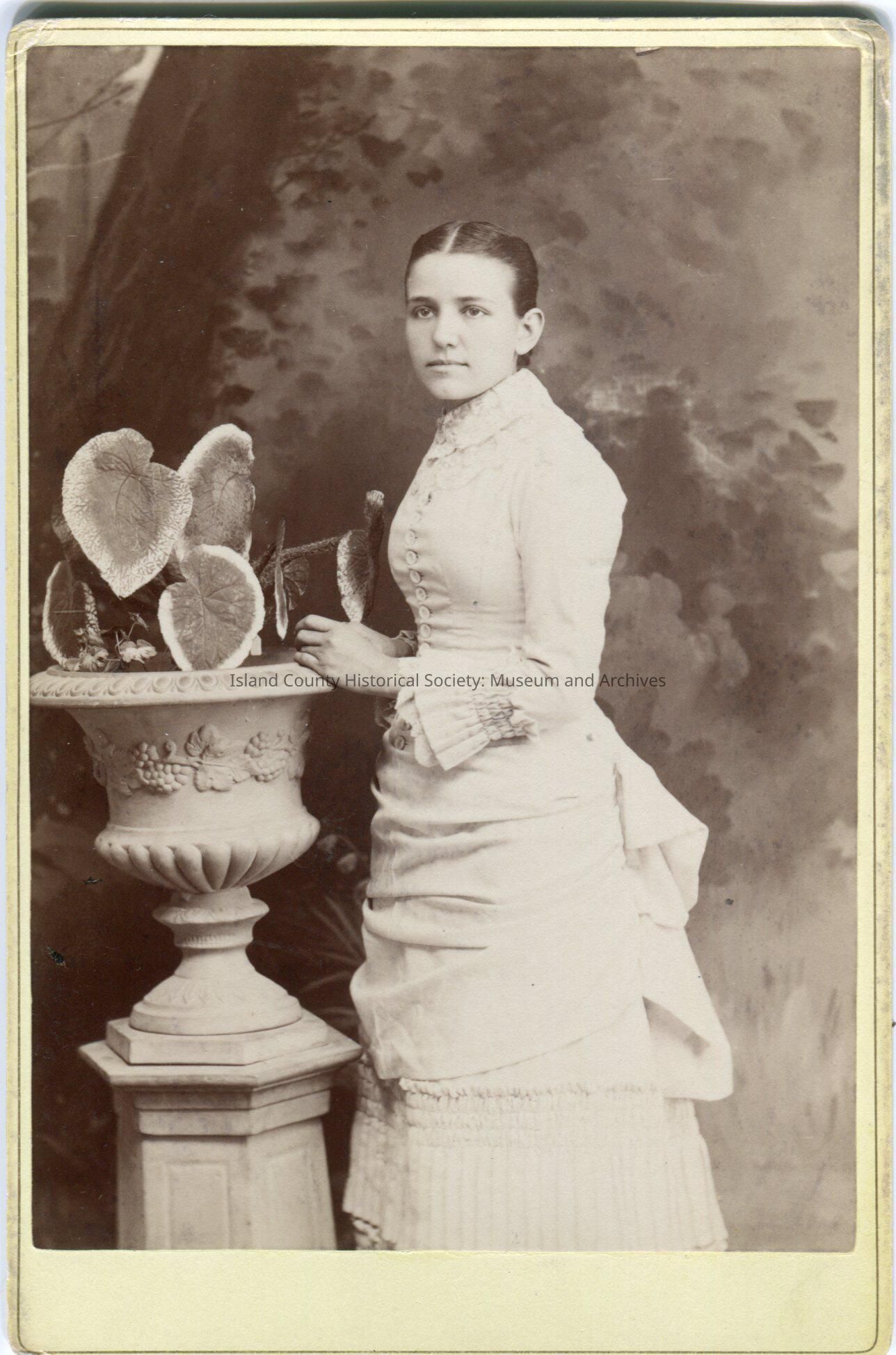 Photo of a woman standing beside a pedastal with a large vase with a plant. She is wearing a dress, draped from the waist, buttons down the front, double-tiered lace collar, pleats and ruffles on the lower part of the skirt/dress and the sleeve ends, with a ruffle at the back of the waist.
