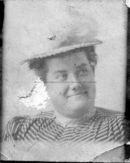 Black & white portrait photo of a smiling Bertha Gillespie. She is wearing a straw hat with flowers and a high-collared striped blouse. No date. The photo was originally stored in the Gillespie, Bertha folder in the Archives Storeroom.