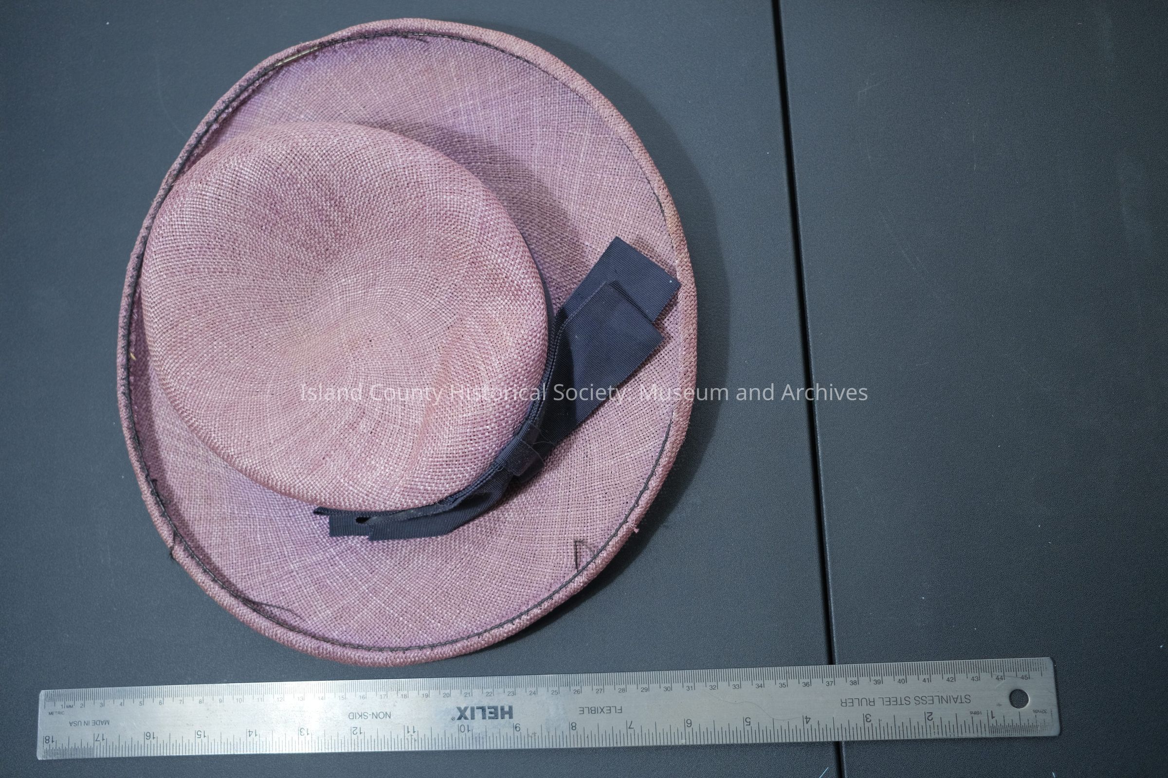 lavender straw hat w/ dark purple bow/ribbon around crown