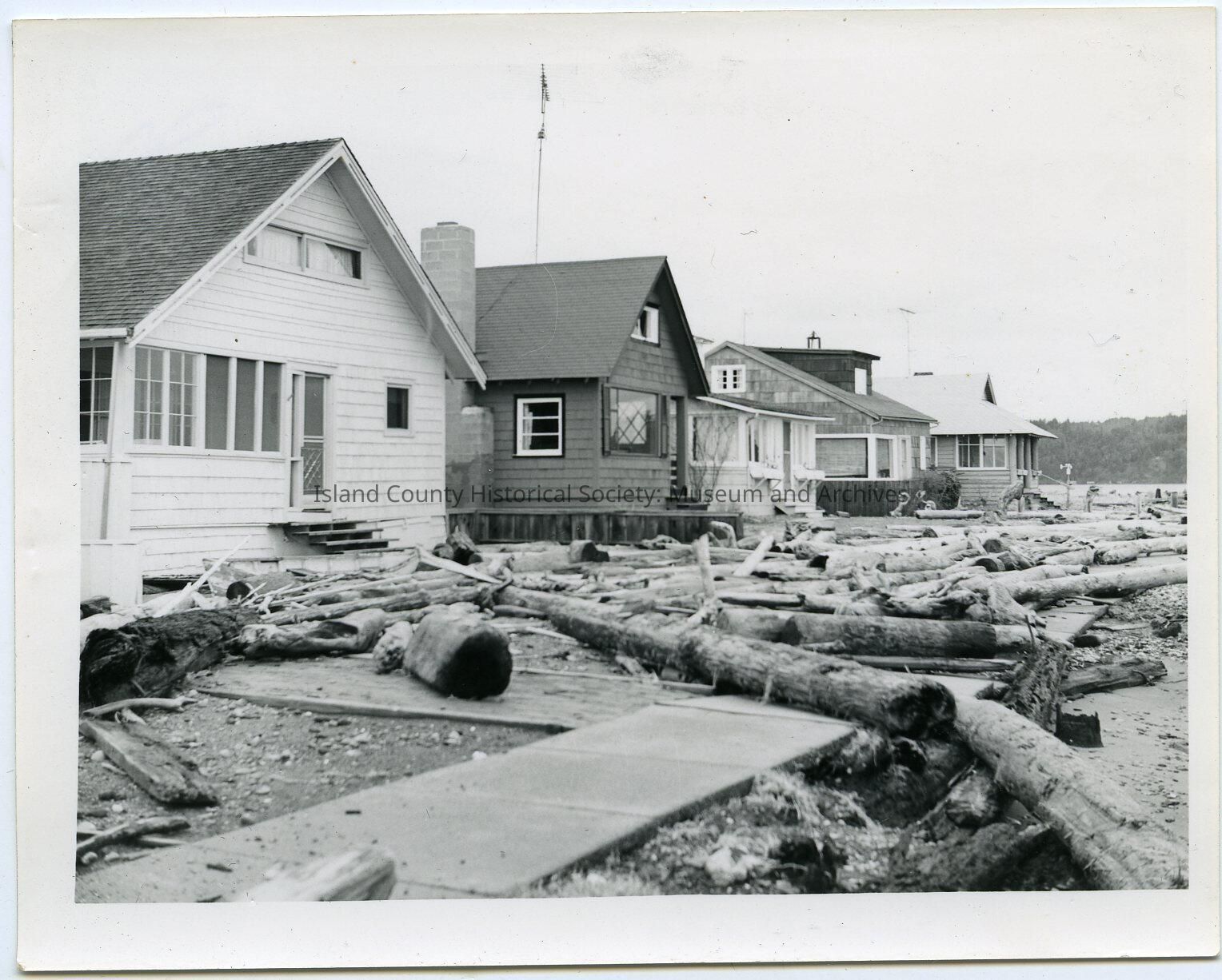 A large amount of driftwood in front of 5 houses. From left to right the houses are white, dark,white and dark dark. A small piece of land can be seen on the right side, in the middle of the photo. The is a sidewalk in the front of the photo.