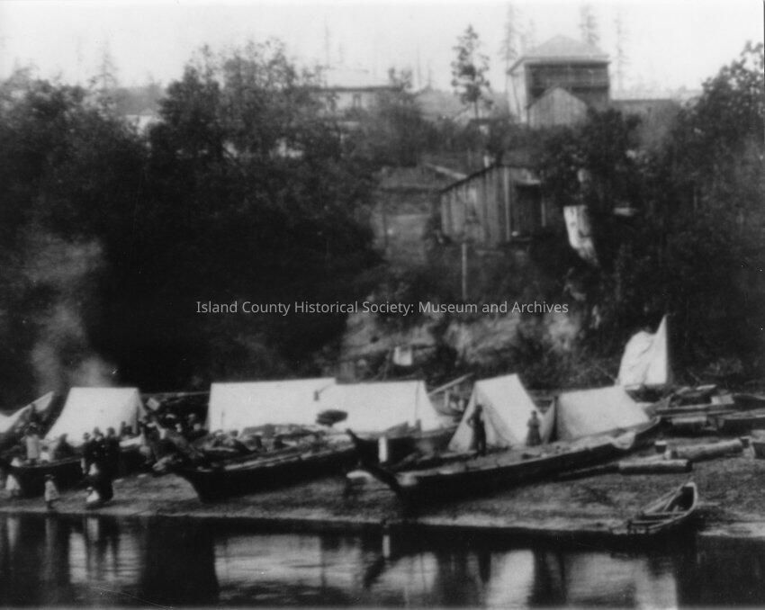 Indigenous Peoples of the Northwest Coast Black and white photo depicting an Indian encampment. Shown are several canoes and tents along the beach.