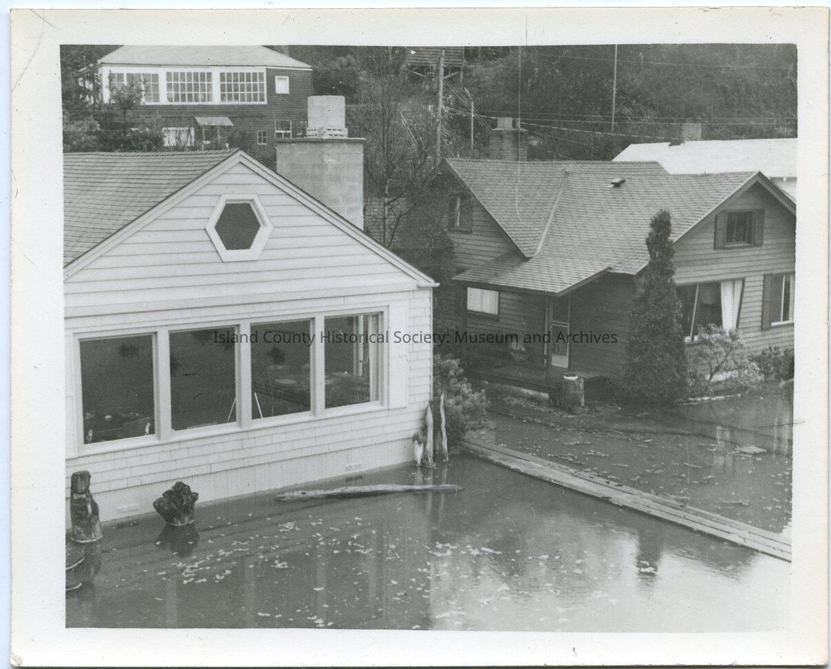 Standing water,(a flood?) in front of a white house and a dark house, in the foreground with a dark house with many windows in the background. There is a sidewalk between the two houses.