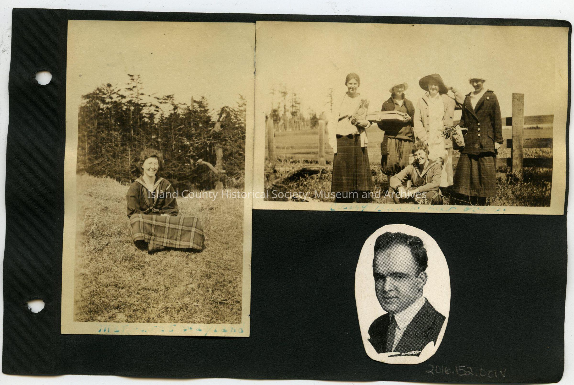 Lower right: Copy of a posed photo of a man in a suit. Curly hair. Photo cut into an oval. 1.5"W x 2"H