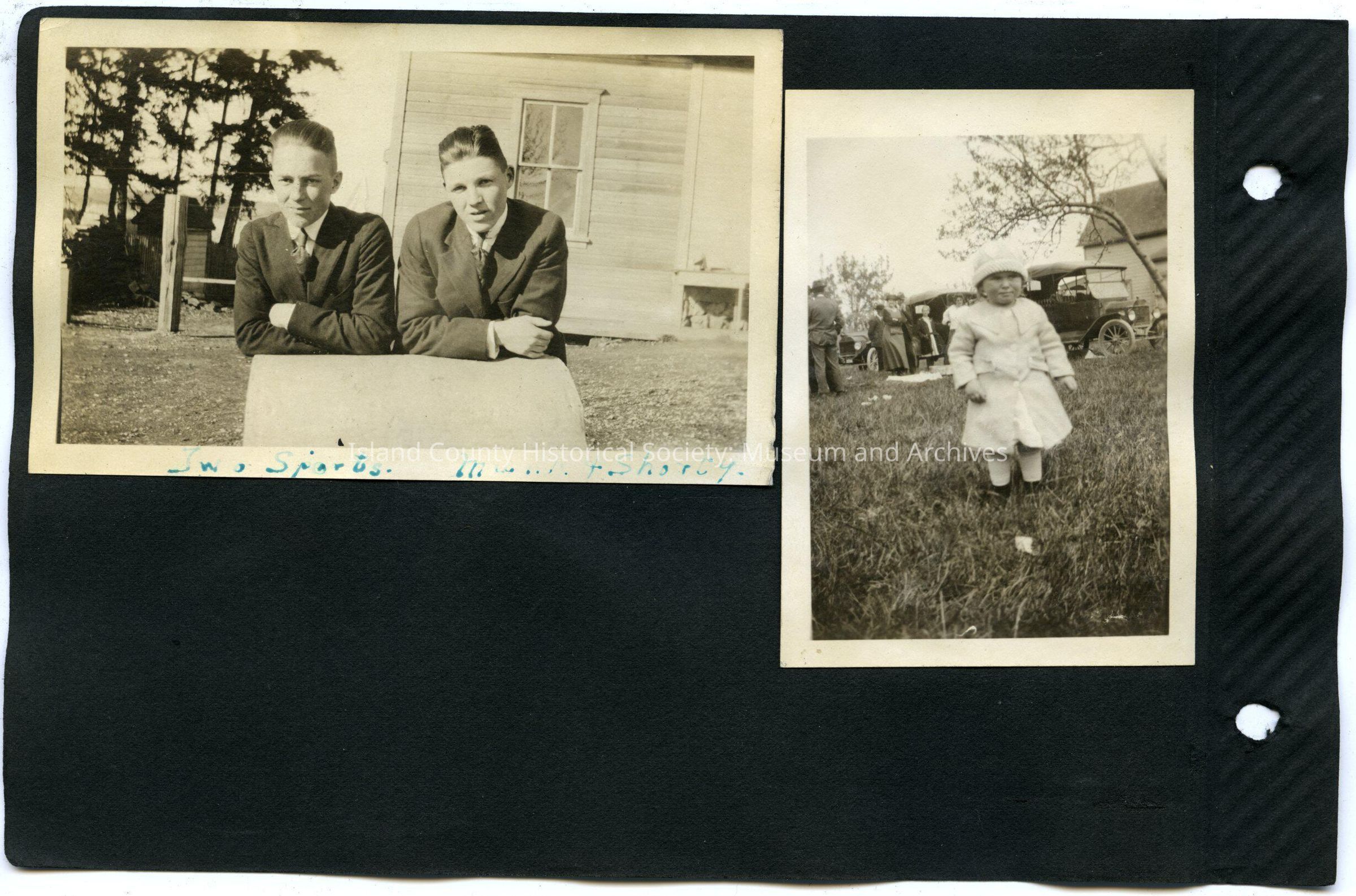 Left: Two young men in front of wooden building leaning on probably a stone. Caption: Two sports, Mark and Shorty. 4.5"W x 2.75"H