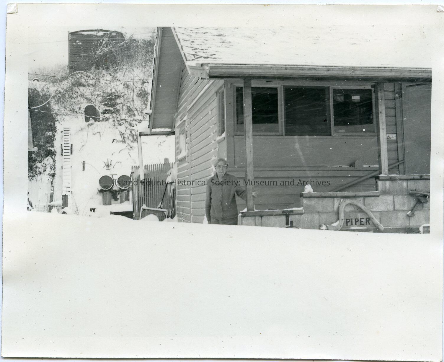 A woman dressed in a coat and wearing glasses is standing in front of the a dark house with snow on the roof and a sign on concrete blocks near the bottom that has Piper written on it. On the left side is a snowy hill with steps leading to a large water tower on top. Written on the back " 1-25-72"