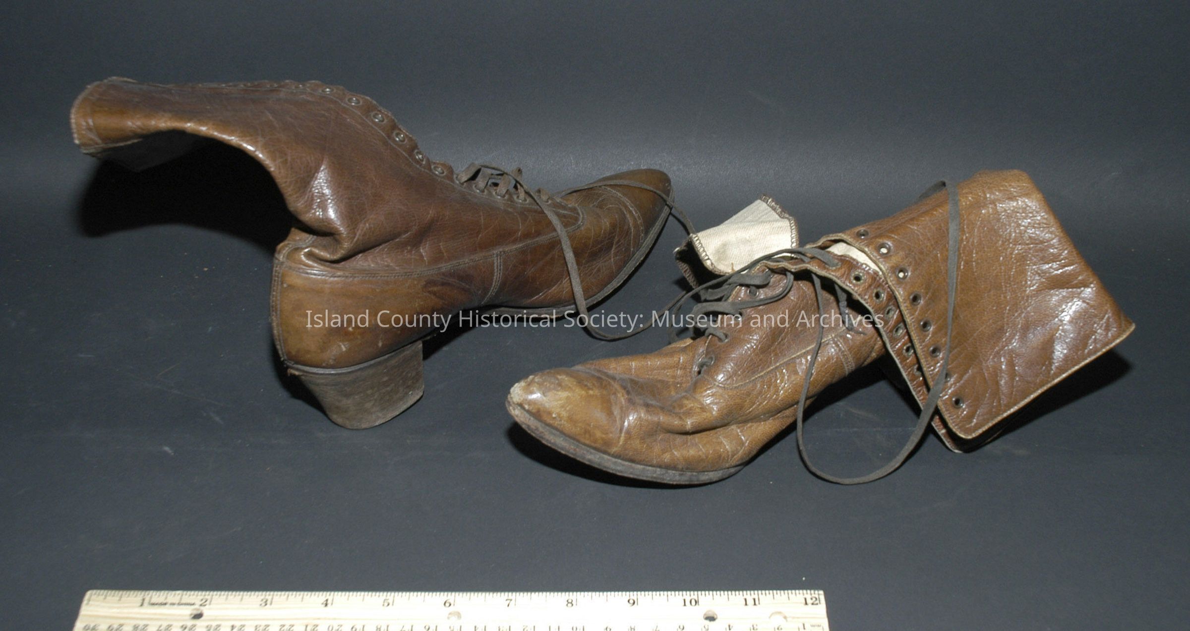 Pair brown leather high top shoes. From Newberry house.