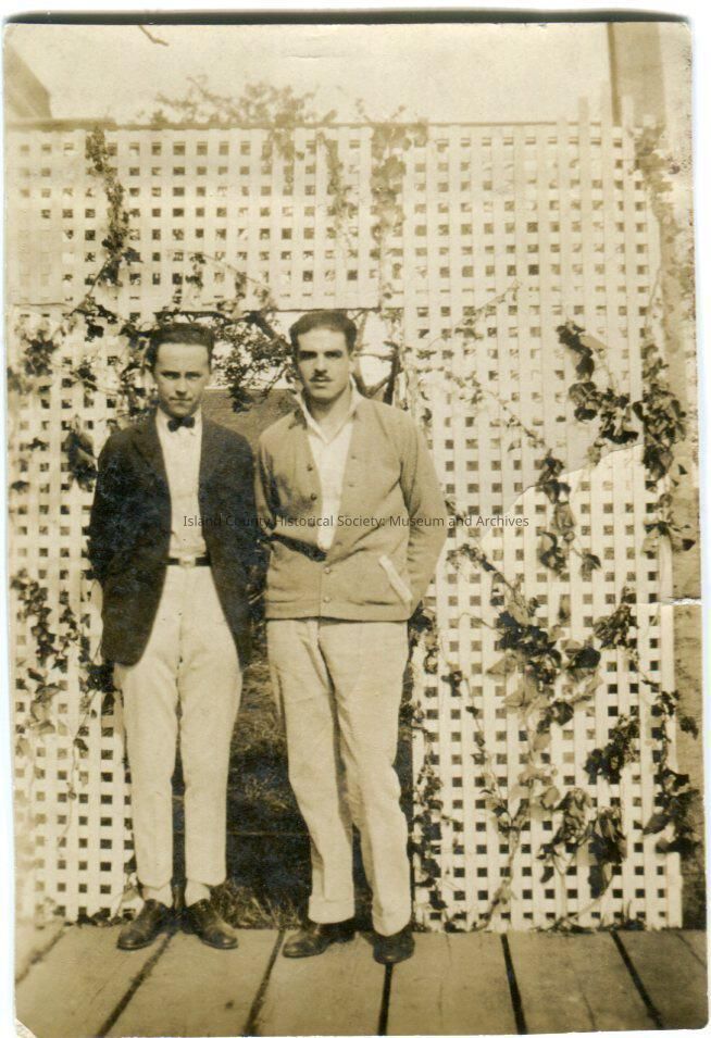 Photo of two men standing in front of a tall trellis with flowers and vines. The man on the left is wearing a suit and bow tie; his trousers are too short. The man on the right is wearing a cardigan and has a mustache. They are standing on wood planks.