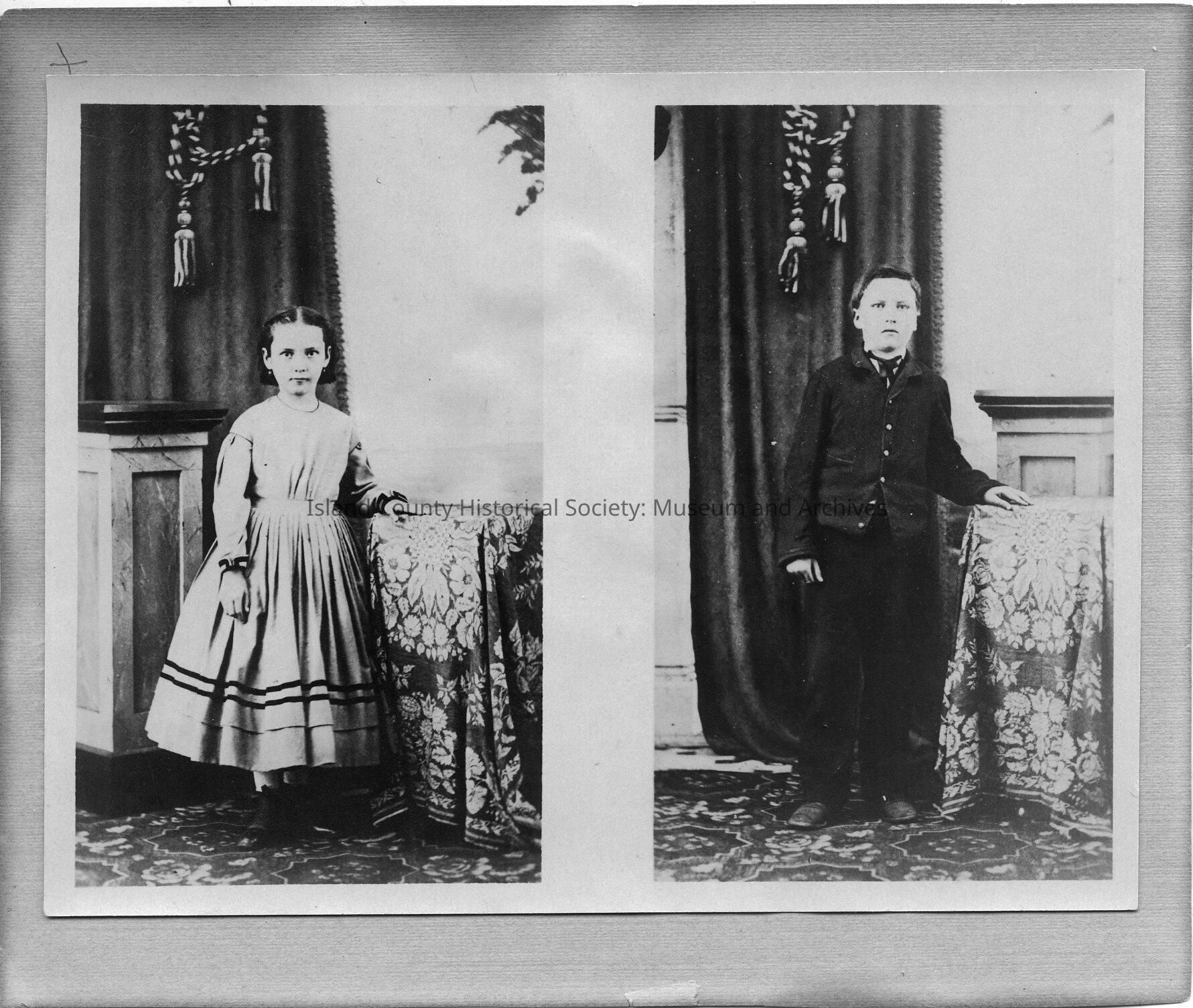 Double photo. Left side is a portrait of a young Keturah Coupe Gillespie in a light-colored long dress with two dark stripes about six inches above the hemline. Her hair is parted in the middle and pulled back. She is standing with her left arm resting on a table covered with a floral tablecloth. The right side of the photo is of a young James Gillespie dressed in dark pants and a dark sweater. His left arm is resting on the same table as the one in the Keturah photo. Photo is mounted on a paper backing. No date.