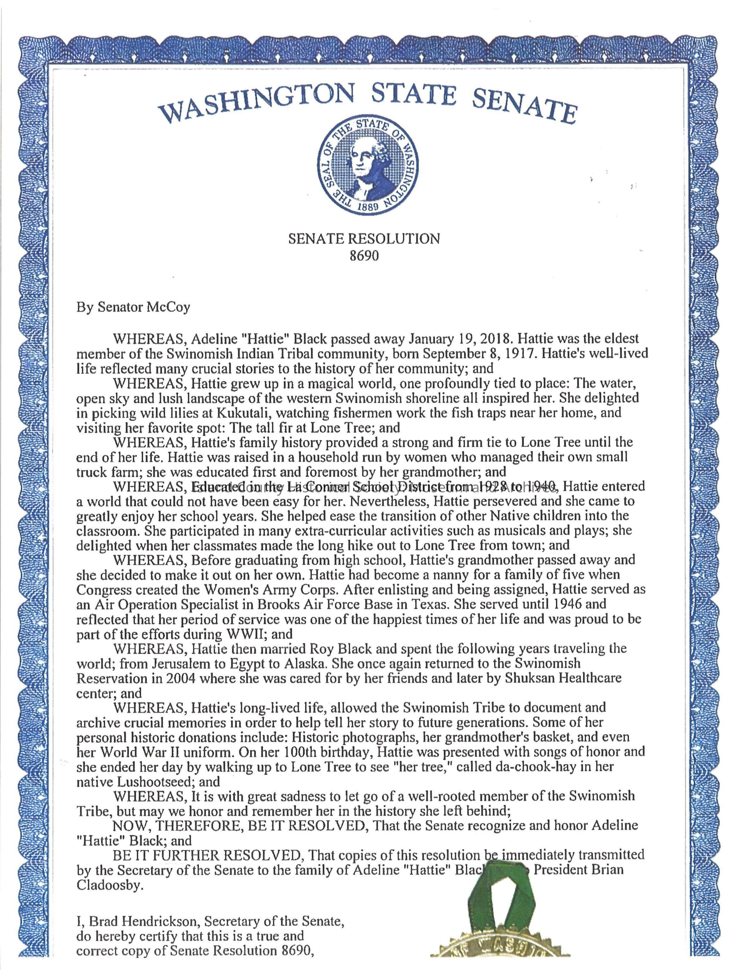Senate Resolution by Washington State Senate regarding Adeline "Hattie" Black of the Swinomish Indian Tribal community upon her death January 19, 2018