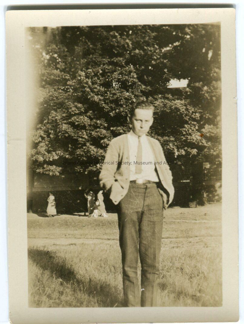 Photo of a young man wearing a trousers, shirt, cardigan and tie. He is standing outside with his hands in his trouser pockets. Trees and a building are in the background. On the path behind him are several women and a child walking in opposite directions.