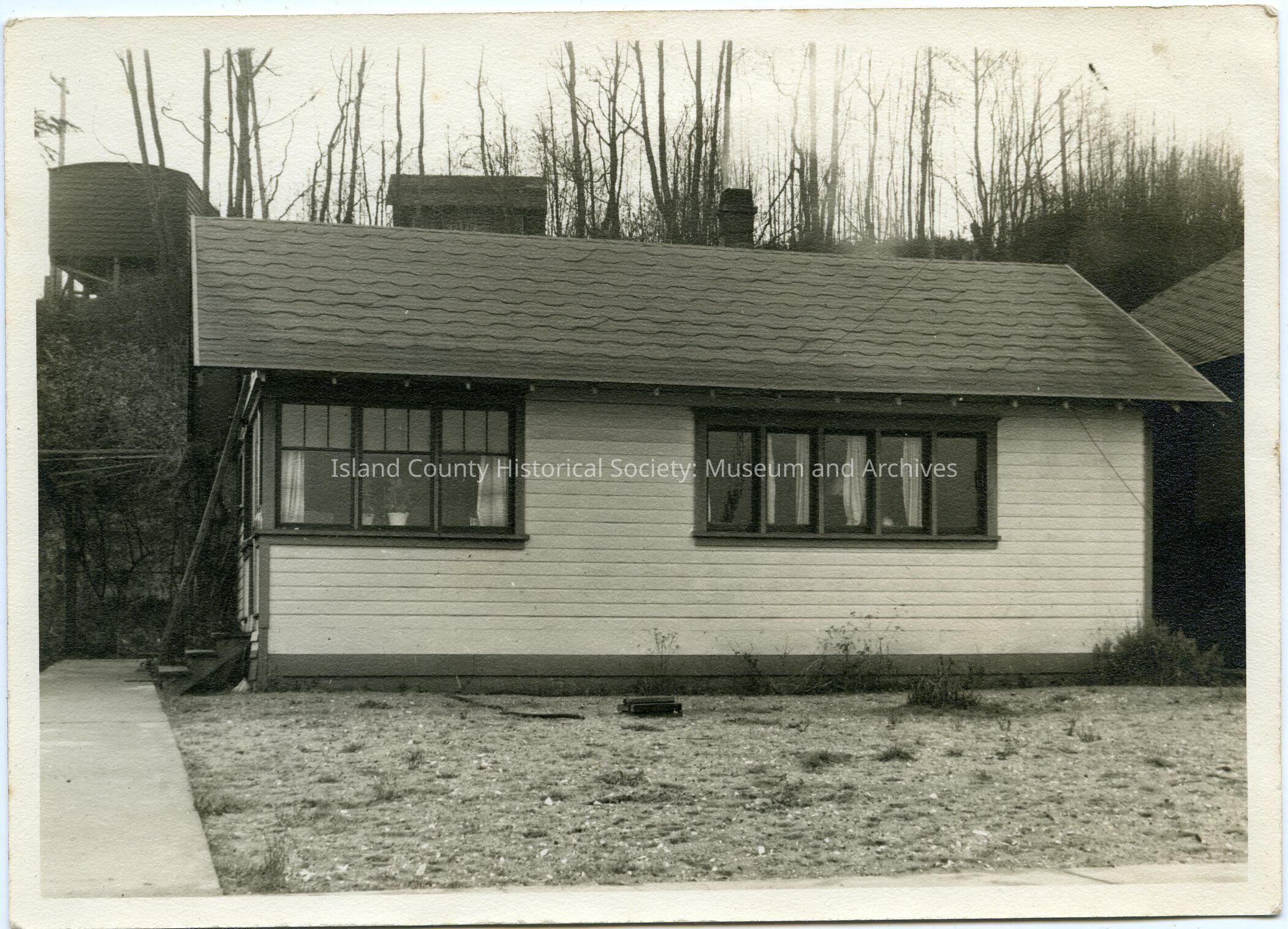 A white house with two sets of windows on the side, There is a cement sidewalk on the left and above is a barn and a house. Beyond that is a line of bare trees. Written on the back " Our home, Sandy Point, Whidbey Island Washington"
