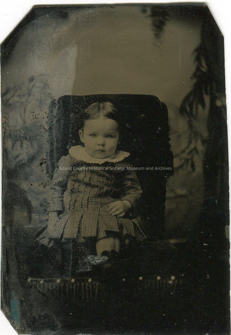 Tintype of a child seated in a chair, wearing a pleated checked long-waisted dress with a wide lace collar. Studio portrait. From a sticky note: Tintype came from the Frank Newberry home. Unknown child. Three corners have been cut at a diagonal. Written on the back: Max Newberry From the Newberry, Max folder