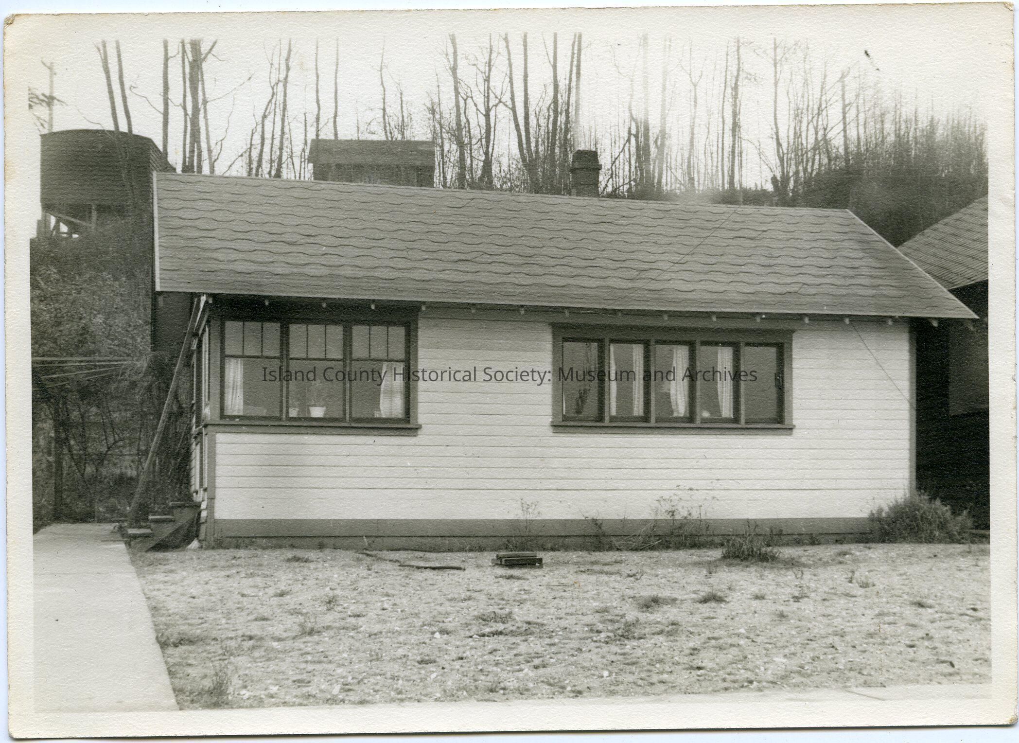 A white house with two sets of windows on the side, There is a cement sidewalk on the left and above is a barn and a house. Beyond that is a line of bare trees. Written on the back " Our home, Sandy Point, Whidbey Island Washington"