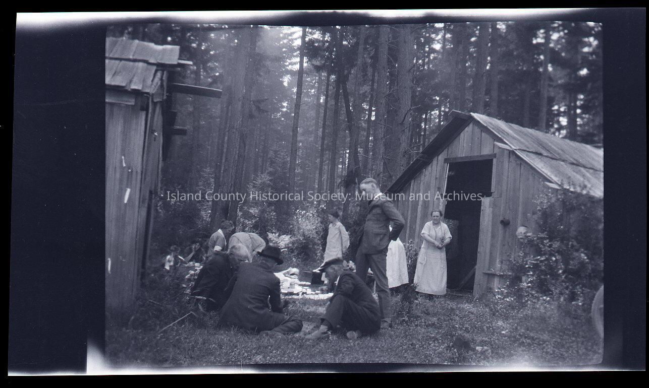 Negative of a group of women and men standing or sitting on the ground between two wood cabins in the woods. These photos are from a Newberry folder. They were in an sleeve marked Newberry.