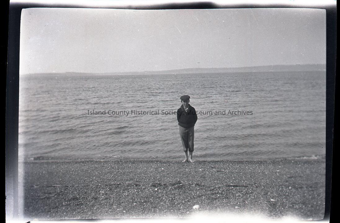 Negative of a young man standing with his bare feet just in the water along a rocky level coastline. He is wearing a cardigan and flat cap. These photos are from a Newberry folder. They were in an sleeve marked Newberry.