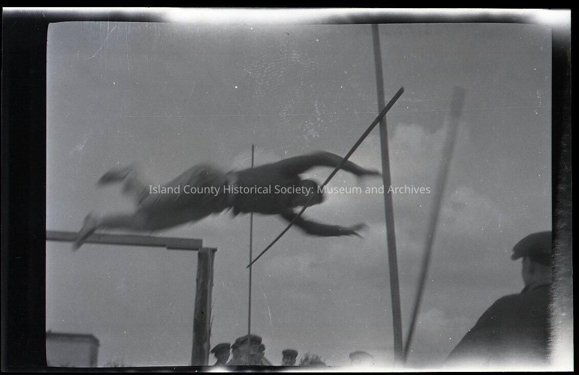 Negative of a young man pole vaulting over a set of bars. There are men standing around. These photos are from a Newberry folder. They were in an sleeve marked Newberry.