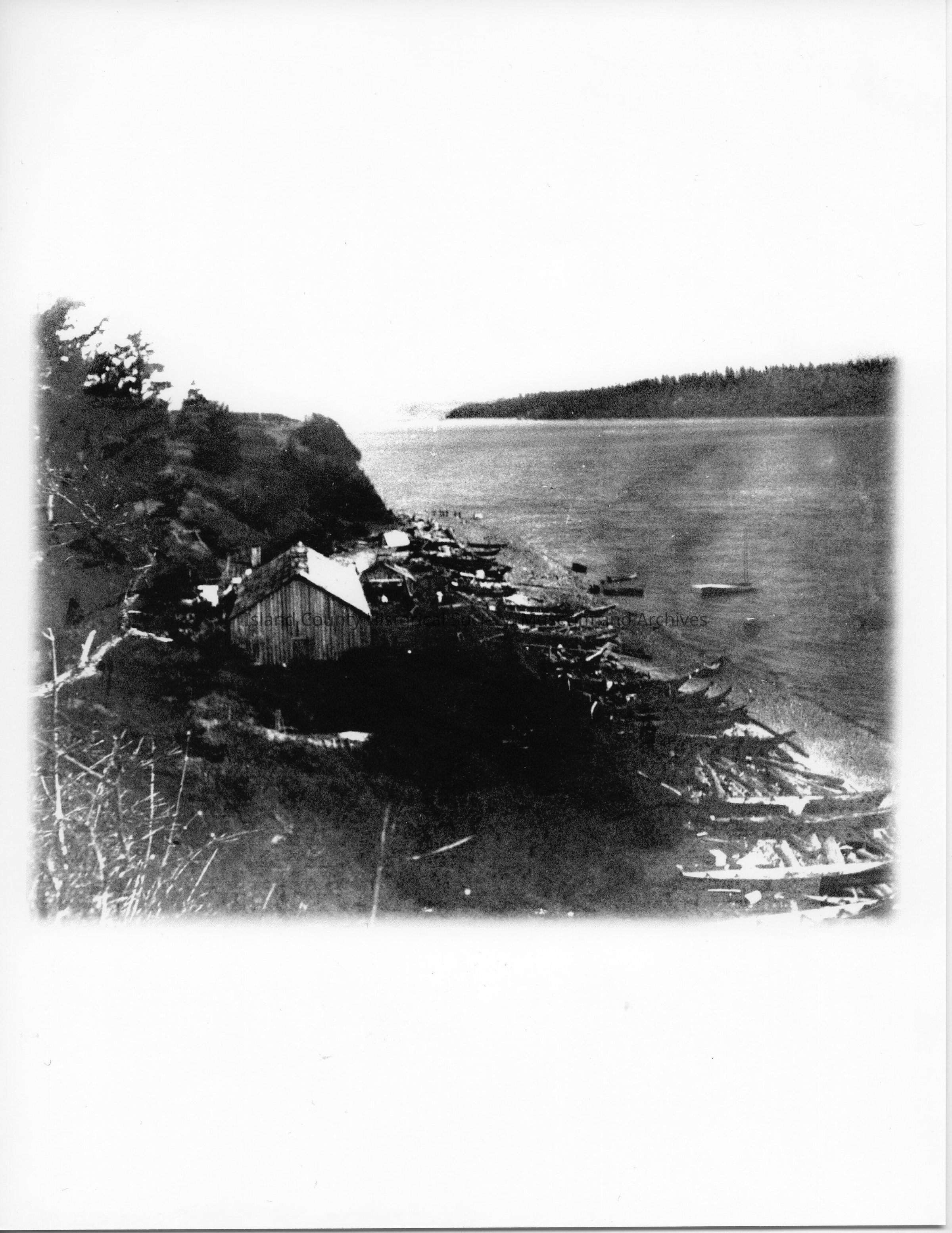Indigenous Peoples of the Northwest Coast Photo showing Indian encampment along the beach with a lodge and several dozen canoes.