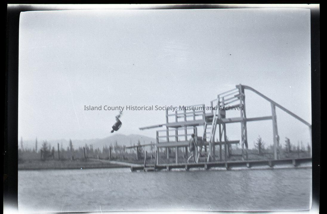 Negative of a structure near the water - probably diving platforms. Someone has jumped off. Another person is walking on the lowest platform. These photos are from a Newberry folder. They were in an sleeve marked Newberry.