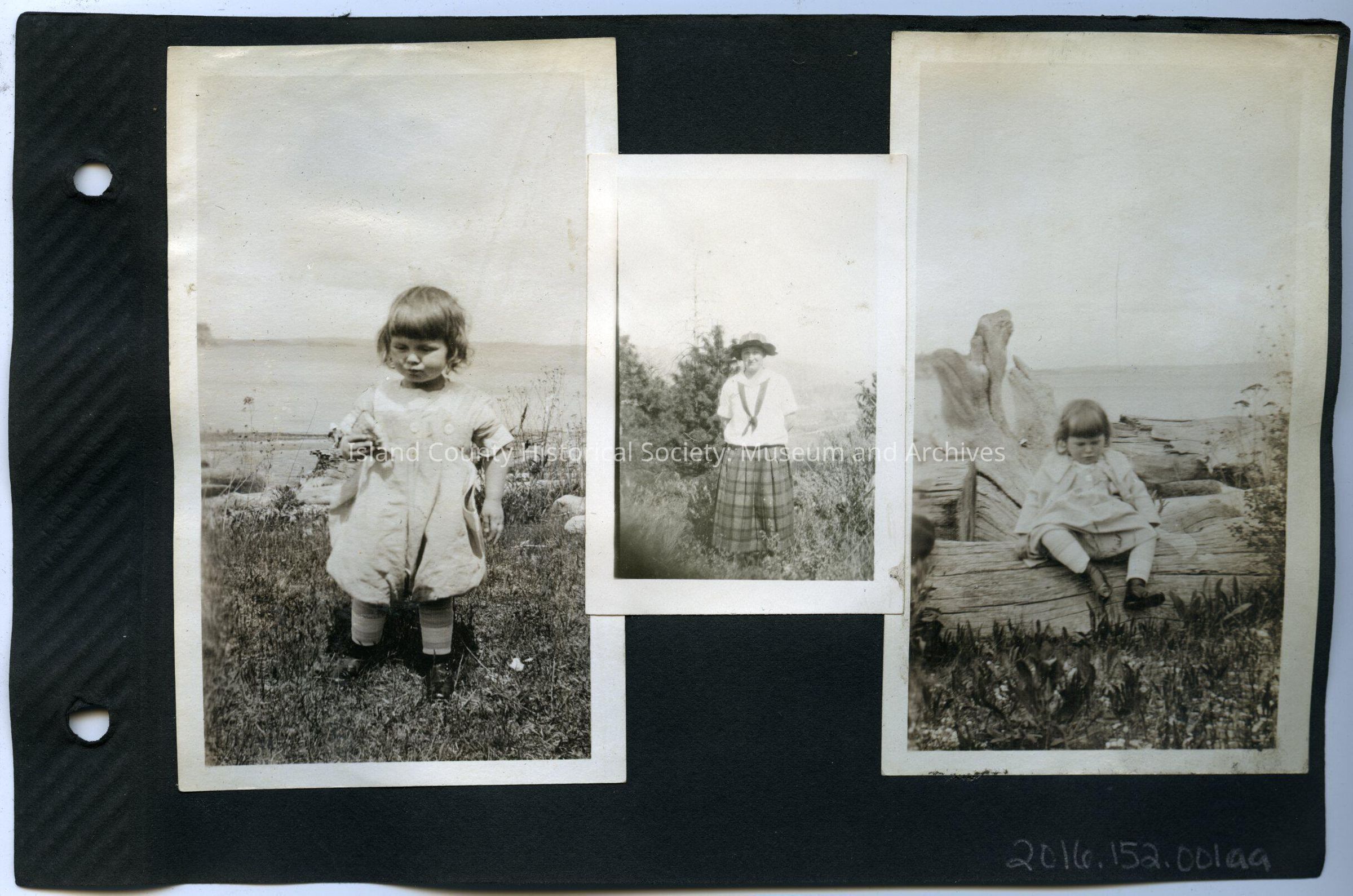 Right: A young girl sitting on a large piece of driftwood, with more driftwood behind her. 2.75" x 4.5"