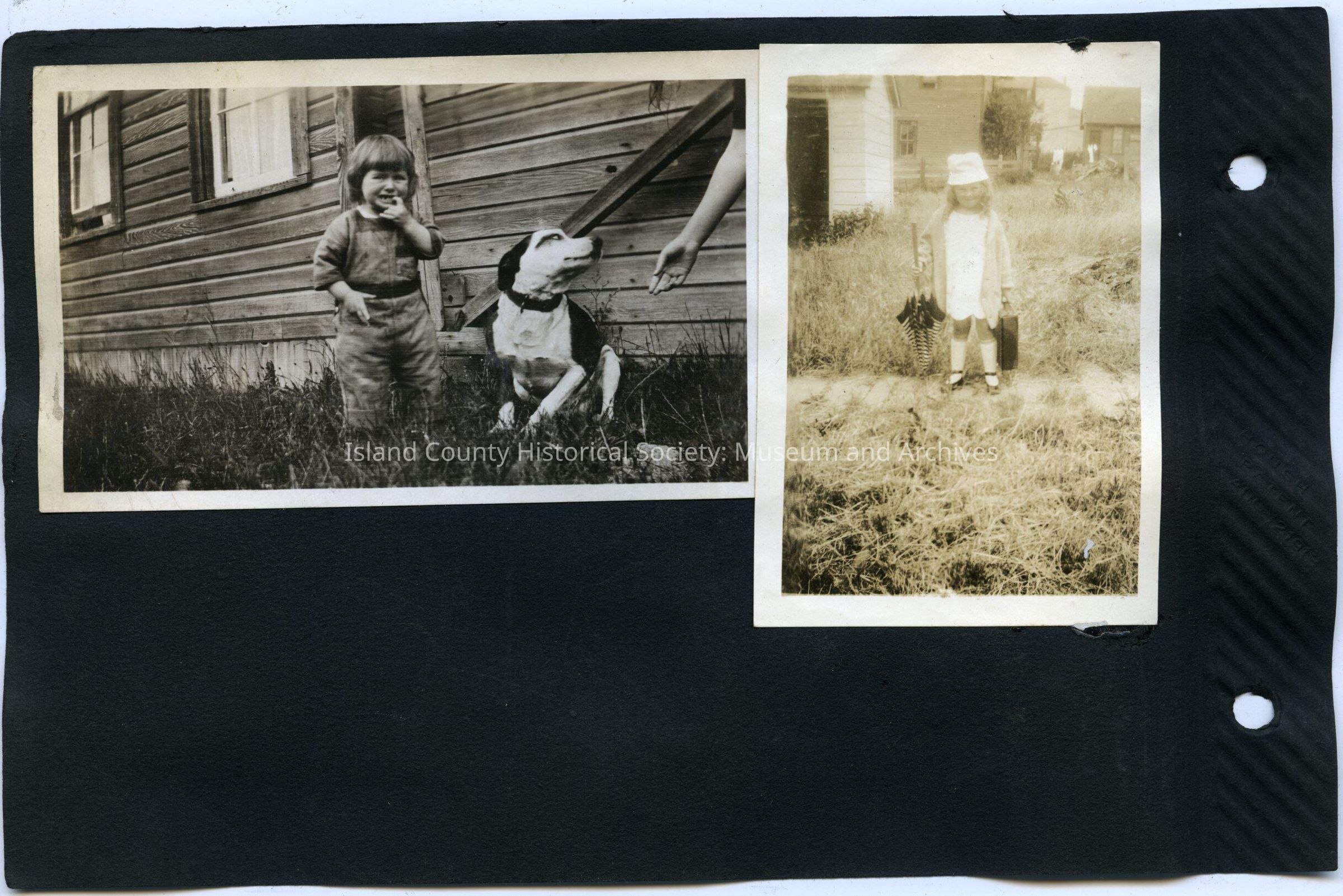 Left: A young boy crying with his black and white dog sitting beside him. 4.5" x 2.75"