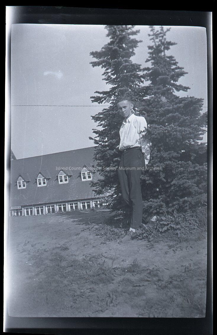 Negative of a young man, casually dressed, standing in front of a couple trees with a large building in the background. The upper story has dormer windows. A sign over the front door: Paradise Inn. (See 2019.012.173)