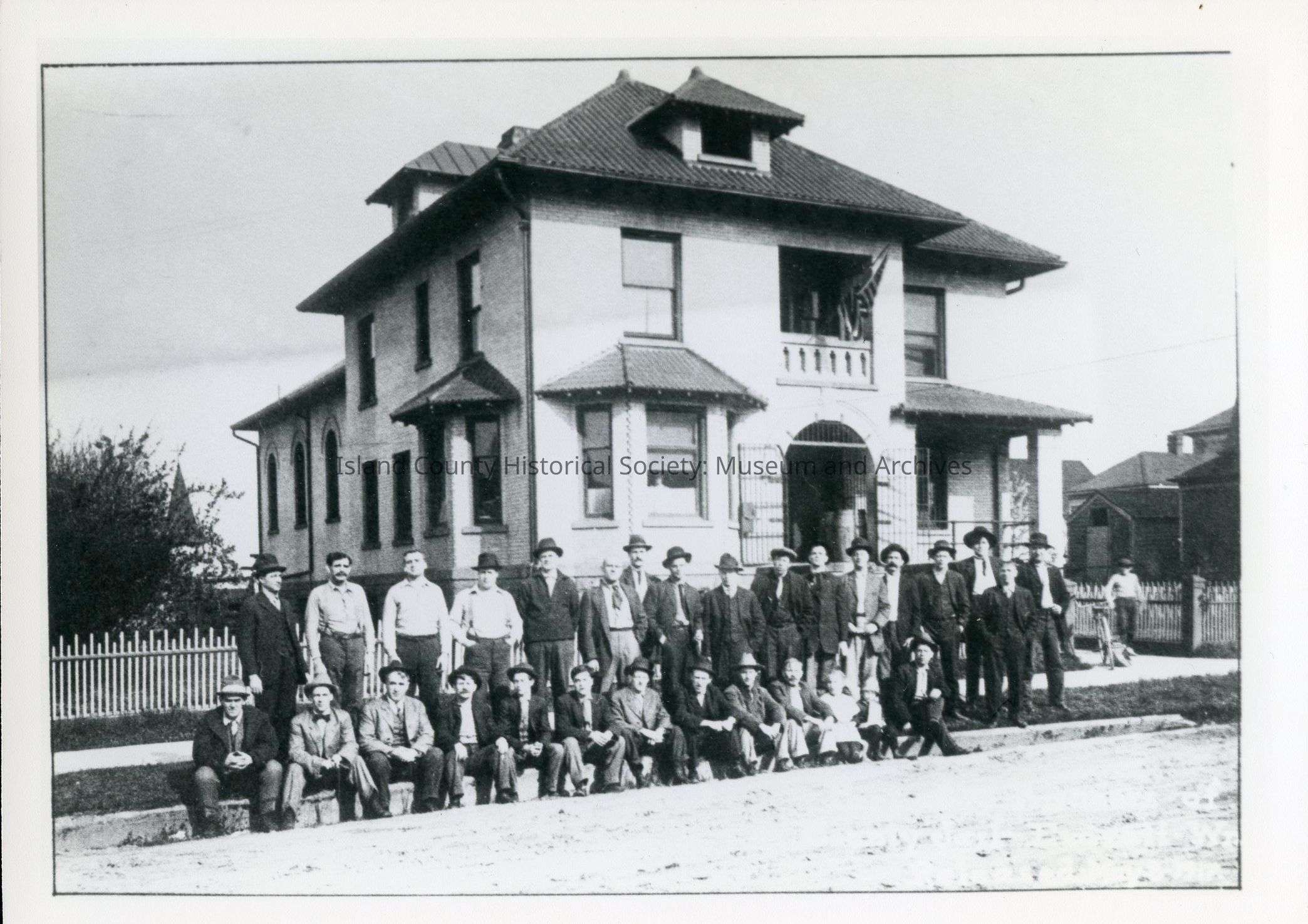 Photograph of the Industrial Workers of the World (IWW) organization outside their meeting hall, likely c. 1916. This group was involved in the Everett Massacre. Photo from Everett Public Library.Photograph Details