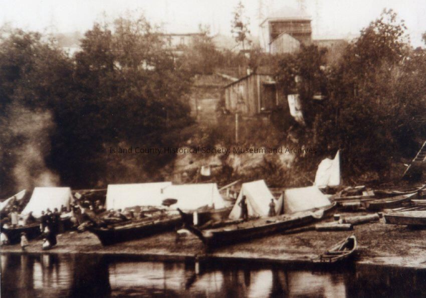Indigenous Peoples of the Northwest Coast Indian encampment showing beach camp with tents and several large sized canoes.