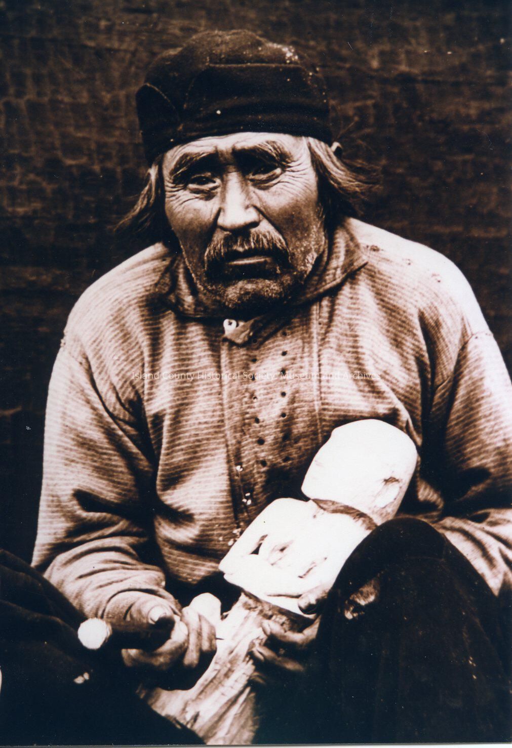 Indigenous Peoples of the Northwest Coast Elderly carver wearing a hat. In one hand he has a carved statue in the other hand he has a carving tool.